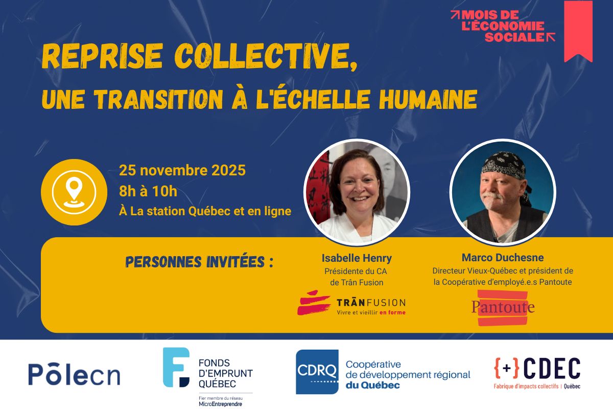 Mardi 25 novembre 2025, La station Québec et le Fonds d’emprunt Québec ont accueilli, en collaboration avec le Pôle CN et la CDEC de Québec, une conférence consacrée à la reprise collective dans le cadre du mois de l’économie sociale.